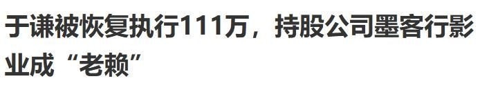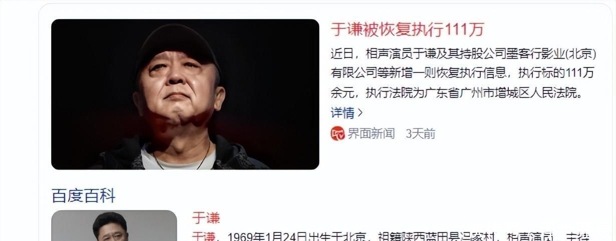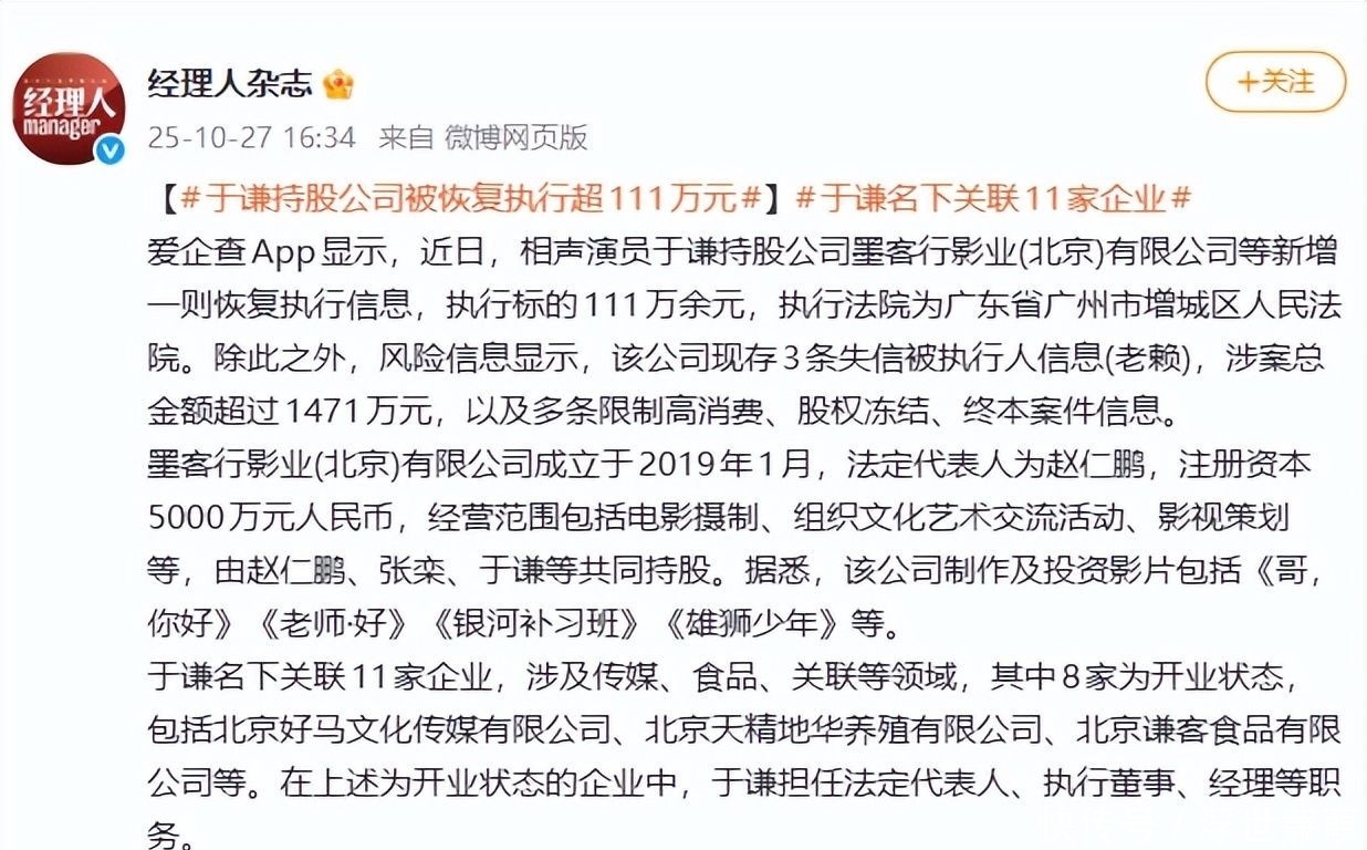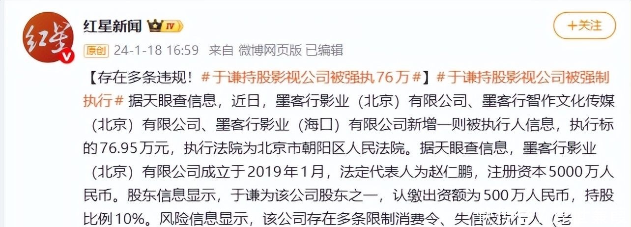 微博|红星新闻:【存在多条违规!#于谦持股影视公司被强执76万#】微博|经理人杂志:【#于谦持股公司被恢复执行超111万元#】界面新闻:于谦被恢复执行111万,持股公司墨客行影业成“老赖”百度百科